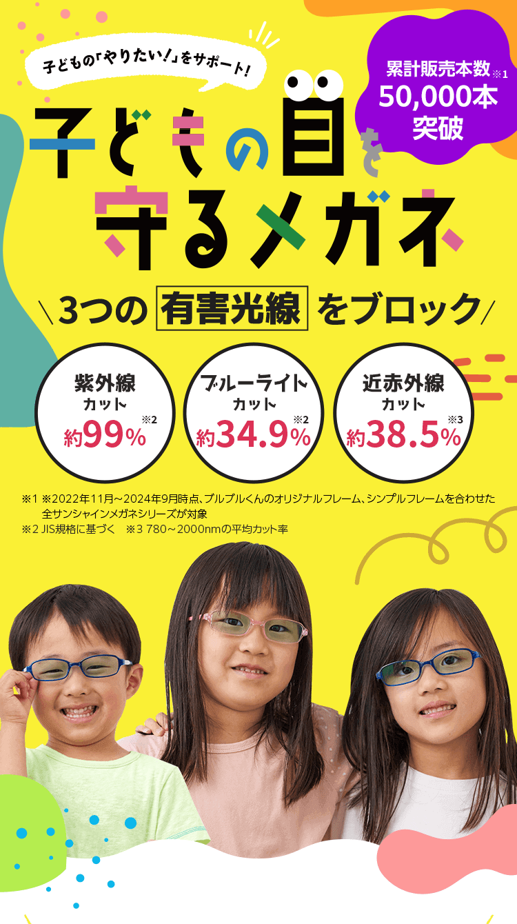 『サンシャインメガネジュニア』は、わかさ生活と日本光材が自信を持ってお届けするメガネです。